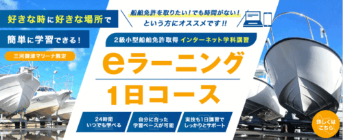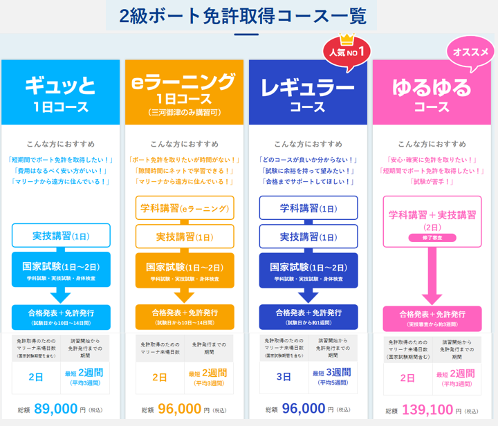 スズキマリーナ三河御津では、2級小型船舶免許を取得する方法として4コースの中からお選びして頂けます。