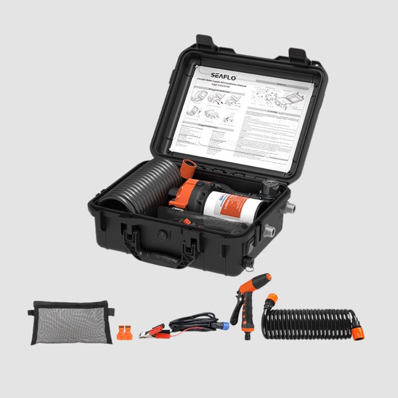 汲み上げの為のホース、起動させる為のバッテリーは