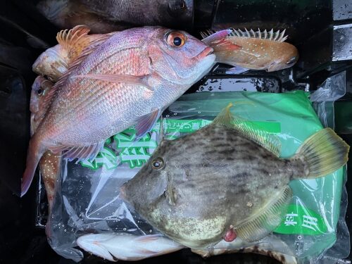 テンヤと胴付仕掛けで、いいサイズの真鯛とカワハギをGET!