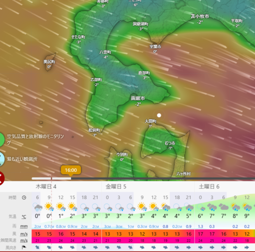気になって青森の 大間 を見てみると風速15ⅿ、最大風速20ⅿオーバーのようです。